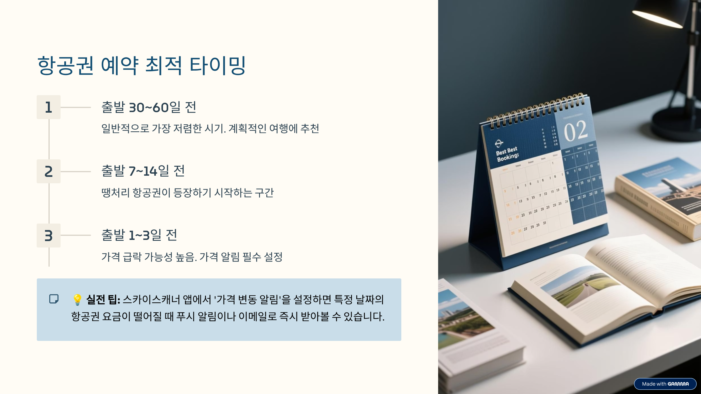 일반적으로 항공권은 출발 30~60일 전에 예약하는 것이 가장 저렴하다는 통계가 있습니다. 하지만 급히 떠나야 하는 여행이라면, 출발 며칠 전까지도 가격이 급락하는 땡처리 항공권을 노려볼 수 있습니다. 스카이스캐너 앱 또는 웹사이트에서 ‘가격 변동 알림’을 설정하면, 특정 날짜의 항공권 요금이 떨어질 때 푸시 알림이나 이메일로 바로 받아볼 수 있습니다.