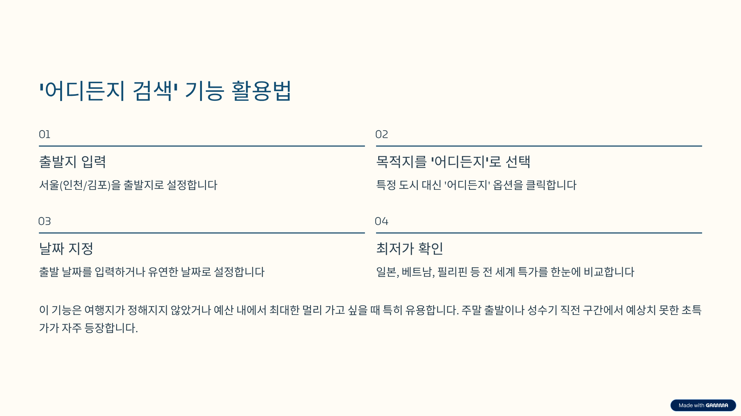 스카이스캐너의 대표 기능인 ‘어디든지 검색’은 출발지를 입력하고 목적지를 ‘어디든지’로 설정하는 방식으로, 현재 가장 저렴한 항공권부터 순서대로 보여줍니다. 예를 들어, ‘서울(인천/김포)’을 출발지로 설정하고 날짜만 지정하면, 일본·베트남·필리핀·국내선 등 다양한 노선의 특가 항공권을 한눈에 비교할 수 있습니다. 특히 주말 출발 항공편이나 성수기 직전 비성수기 구간은 예상치 못한 초특가 땡처리 항공권이 자주 등장합니다.