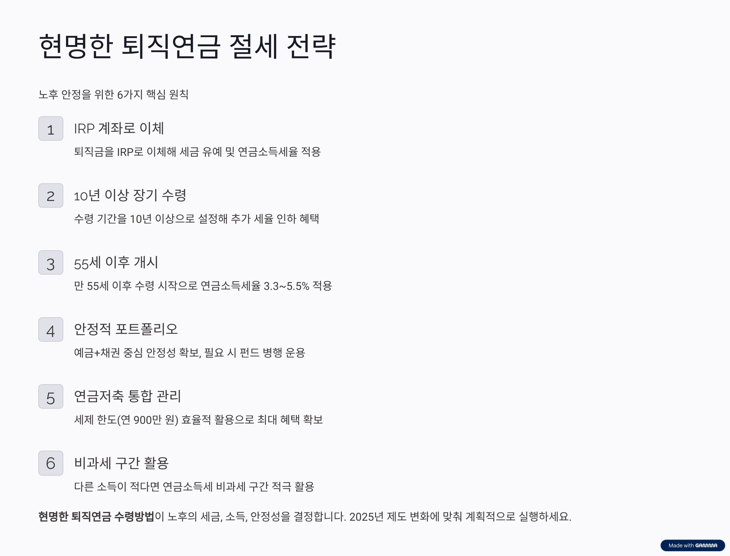 1️⃣ 퇴직금은 **IRP로 이체**해 세금 유예. 2️⃣ 연금 수령 기간은 **10년 이상**으로 설정하면 추가 세율 인하. 3️⃣ **55세 이후 수령 시작**으로 연금소득세율 3.3~5.5% 적용. 4️⃣ IRP 운용 시 예금+채권 중심으로 안정성 확보, 필요 시 펀드 병행. 5️⃣ 연금저축과 통합 관리로 **세제 한도(연 900만 원까지)** 효율적으로 활용. 6️⃣ 퇴직 후 다른 소득이 많지 않다면 **연금소득세 비과세 구간** 적극 활용.
