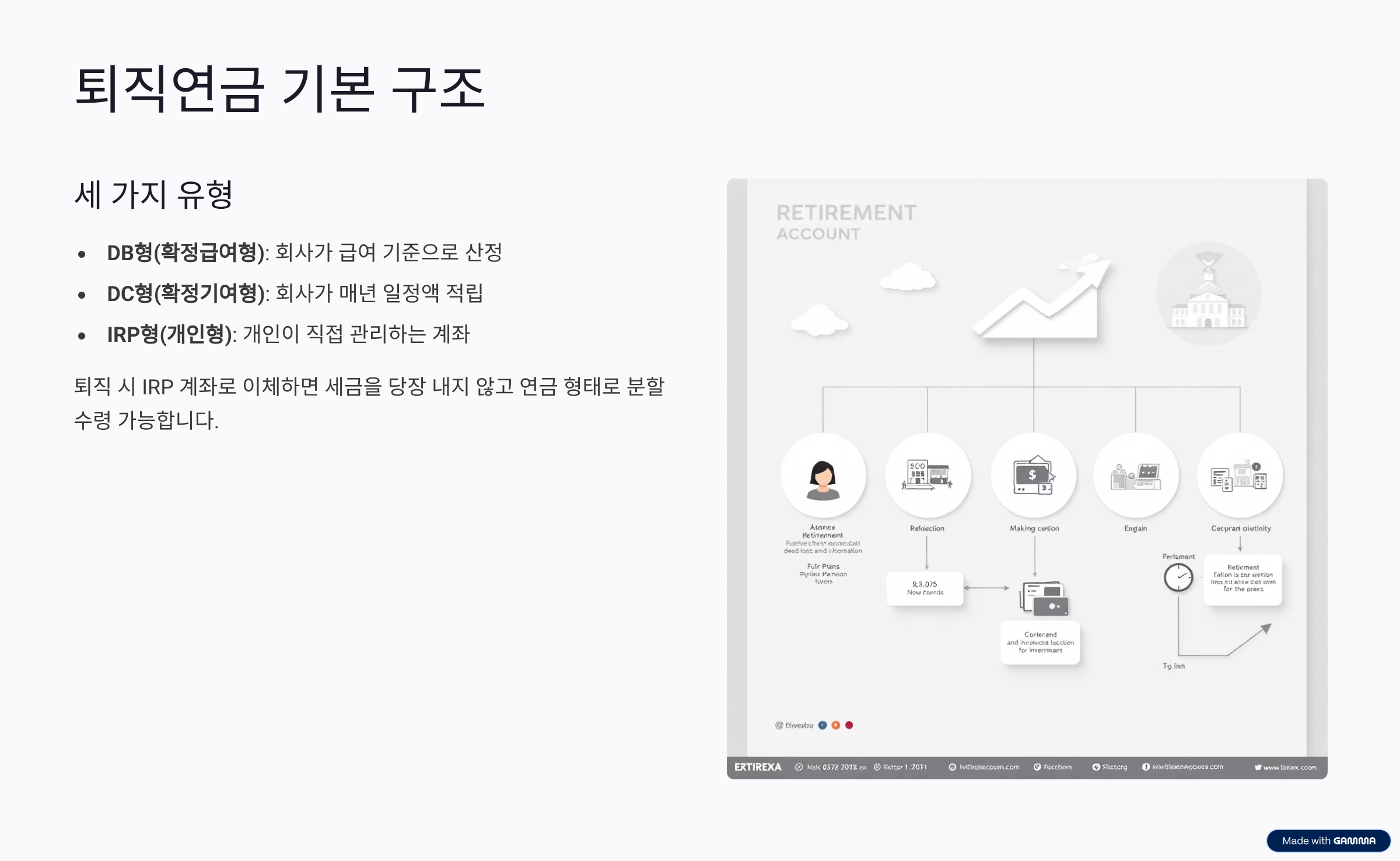 퇴직연금은 크게 DB형(확정급여형), DC형(확정기여형), IRP형(개인형 퇴직연금)으로 나뉩니다. 회사를 통해 적립된 퇴직금은 퇴직 시 IRP 계좌로 이체하거나, 일시금으로 바로 받을 수 있습니다. IRP 계좌로 옮기면 세금을 당장 내지 않고, 이후에 연금 형태로 분할 수령할 수 있어 **세금 절감 효과**가 큽니다. 반대로 일시금으로 바로 받으면 퇴직소득세를 한 번에 납부해야 하며, 세율도 더 높아질 수 있습니다.