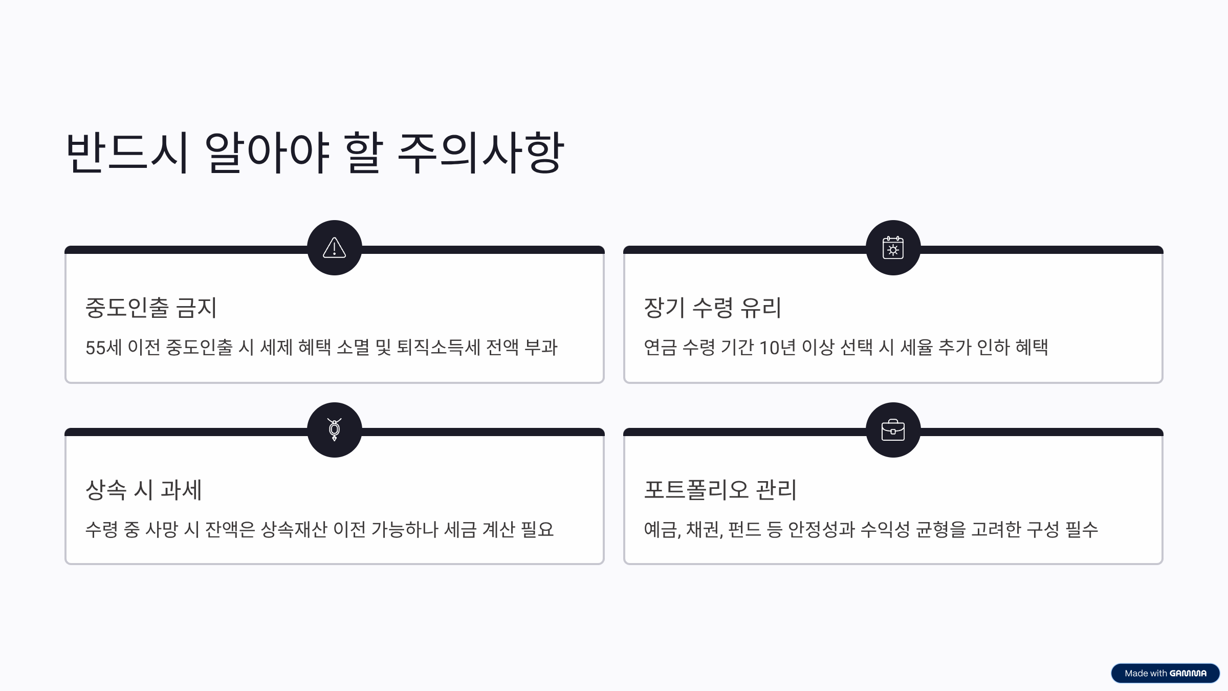 - IRP 계좌로 이체 후 **55세 이전에 중도인출**하면 세제 혜택이 사라지고 퇴직소득세 전액이 부과됩니다. - **연금 수령 기간이 10년 이상**이면 세율이 추가로 낮아집니다. - 연금 수령 중 사망 시 잔액은 상속재산으로 이전 가능하지만, **연금소득세 부과 후 상속세 계산**이 필요합니다. - IRP 내 투자 상품은 예금, 채권형, 펀드형 등 다양하므로 **안정성과 수익성 균형**을 고려해 포트폴리오를 구성해야 합니다.