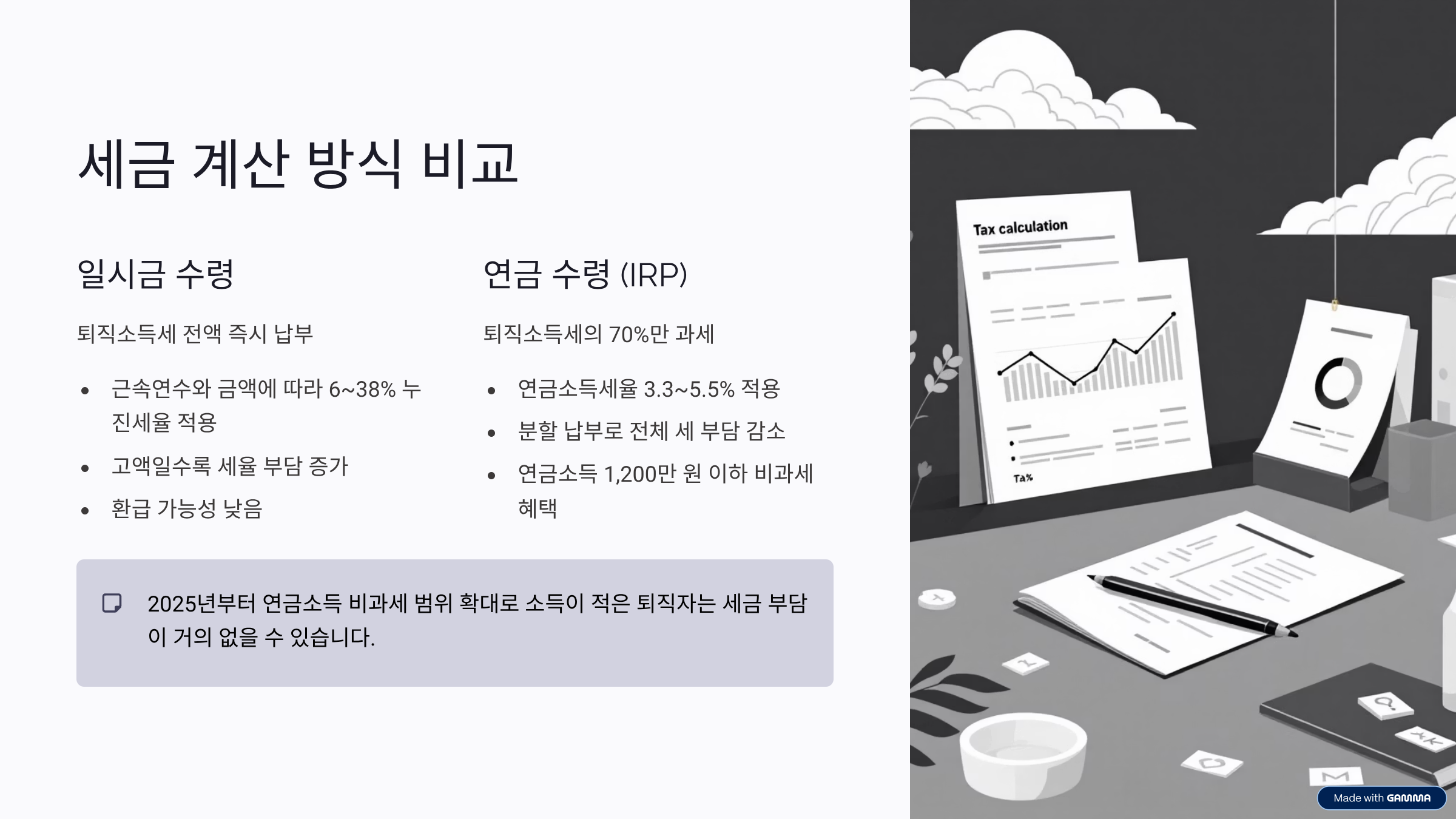 퇴직금을 일시금으로 받으면 퇴직소득세가 한 번에 부과됩니다. 세율은 근속연수와 퇴직금 규모에 따라 차등 적용되며, 대략 **6~38% 누진세율** 구조입니다. 반면 IRP로 이체해 연금으로 수령할 경우, 퇴직소득세의 70%만 과세되고, 이를 다시 연금소득세율(3.3~5.5%)로 분할 납부합니다. 즉, 세금을 나누어 내기 때문에 전체 세 부담이 줄어드는 구조입니다. 2025년부터는 연금소득 1,200만 원 이하 구간 비과세 범위도 확대되어 소득이 적은 퇴직자는 세금이 거의 없을 수도 있습니다.