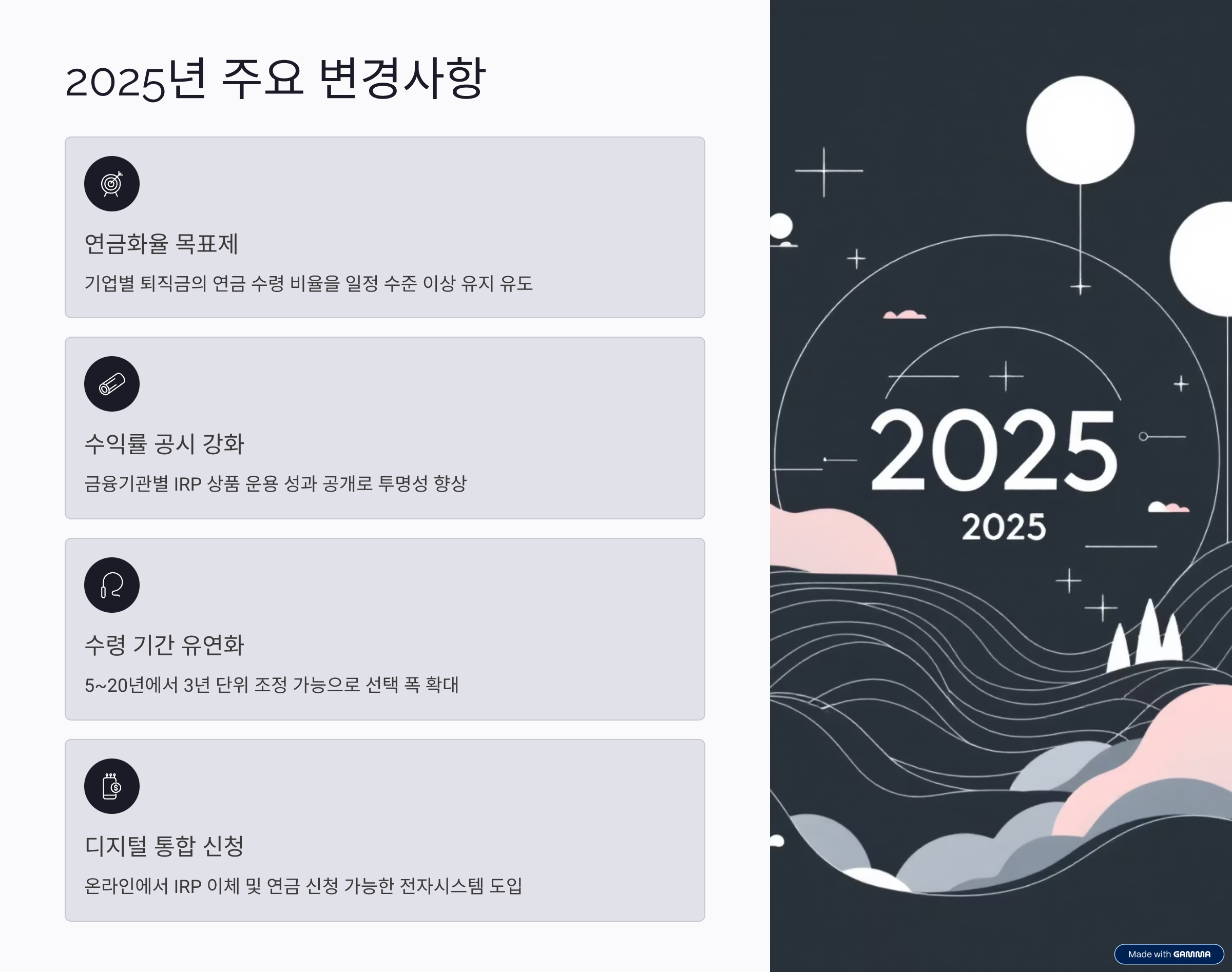 - **연금화율 목표제 도입**: 기업별 퇴직금의 연금 수령 비율을 일정 수준 이상 유지하도록 유도. - **IRP 수익률 공시 강화**: 금융기관별 IRP 상품의 운용 성과가 공시되어 투명성 제고. - **연금 수령 기간 유연화**: 기존 5~20년에서 3년 단위 조정 가능으로 변경되어 선택 폭 확대. - **디지털 전자통합 신청제도** 도입으로, 퇴직 후 온라인에서 IRP 이체·연금 신청 가능.