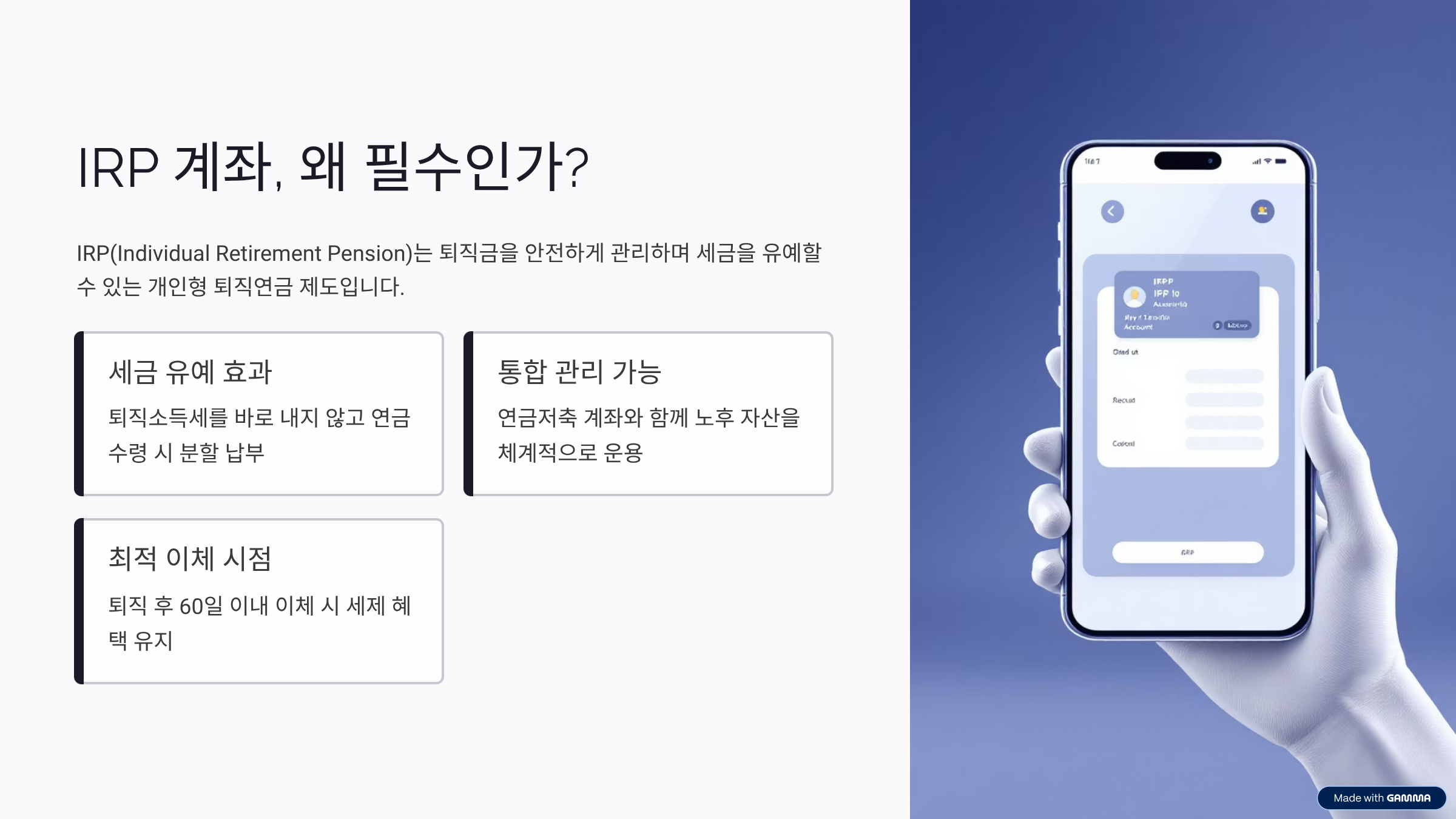 IRP(Individual Retirement Pension)는 개인형 퇴직연금으로, 퇴직 후 퇴직금을 안전하게 관리하면서 세금을 유예할 수 있는 제도입니다. 퇴직 시 퇴직금을 IRP로 이체하면 퇴직소득세를 바로 내지 않고, 연금으로 받을 때 나누어 납부할 수 있습니다. 또한, IRP는 연금저축 계좌와 통합 관리도 가능하여, 국민연금 등과 함께 노후 자산을 체계적으로 운용할 수 있습니다. 2025년 기준, IRP 계좌의 연금 이체 시점은 **퇴직 후 60일 이내**가 가장 유리하며, 세제 혜택도 유지됩니다.