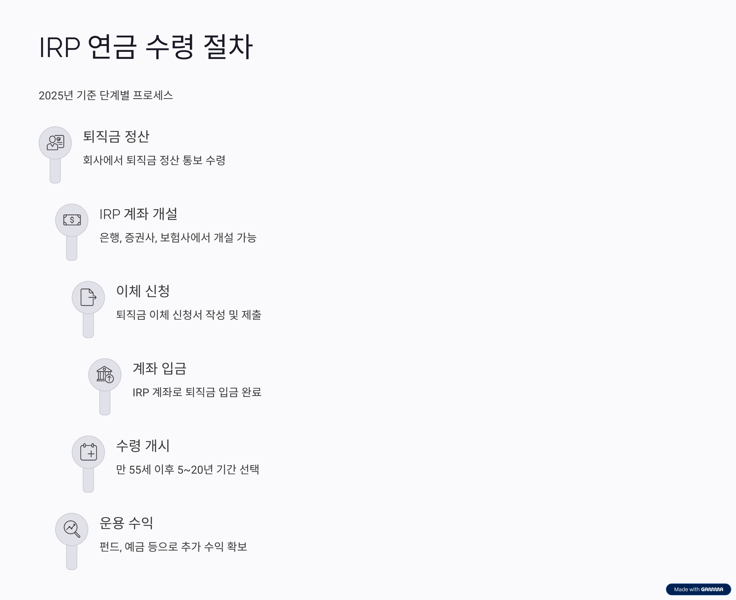 1. 퇴직 후 회사에서 **퇴직금 정산** 통보를 받습니다. 2. **IRP 계좌 개설** (은행, 증권사, 보험사 모두 가능). 3. **퇴직금 이체 신청서**를 작성해 회사에 제출합니다. 4. IRP 계좌로 퇴직금이 입금되면, 본인이 원하는 연금 수령 개시 시점을 지정합니다. 5. 만 55세 이후부터 연금 수령이 가능하며, 기간은 5년 이상(최대 20년까지) 선택할 수 있습니다. 6. 수령 중에도 IRP 내에서 펀드, 예금 등 다양한 상품으로 **운용 수익을 추가 확보**할 수 있습니다.